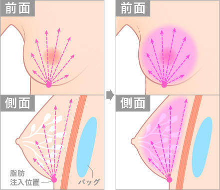 痩せている方でも無理なくバストアップすることができ、豊胸バッグ挿入後、バッグの縁など形が浮き出てしまったり、不自然さが目立つ部分に脂肪を注入するので、自然な見た目や手触りとなります。