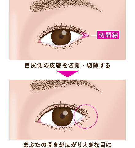 「目尻切開」は、目尻を数ミリ切開し、目の横幅を広げる施術です。