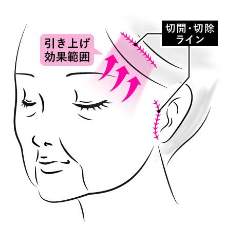 上まぶたや目尻のたるみ・シワの原因となっているたるんだ皮膚を、側頭部あたりで切除して、皮膚をしっかりと引き上げます。皮膚そのものをダイレクトに引き上げるので、しっかりとしたリフトアップ効果を発揮し、傷跡が目立たない自然な仕上がりを叶えます。
