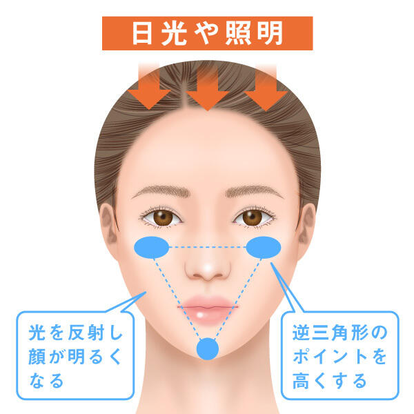 光の当たるポイントをつくると、光の反射効果で蛍光灯や自然光がスポットライトとなり顔を自然に輝かせてくれます。正三角形を意識した注入で、美しく見える顔立ちをつくっていきます。