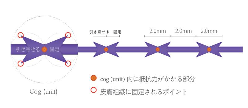 また従来の糸リフトは、糸が溶ける過程で引き上げ効果が弱まってしまうことがありましたが、エピティコン糸ではこのリボン型のコグを利用することにより、部分的に糸が溶けてしまったり切れてしまった場合でも、よりリフティング効果を持続させることができます。