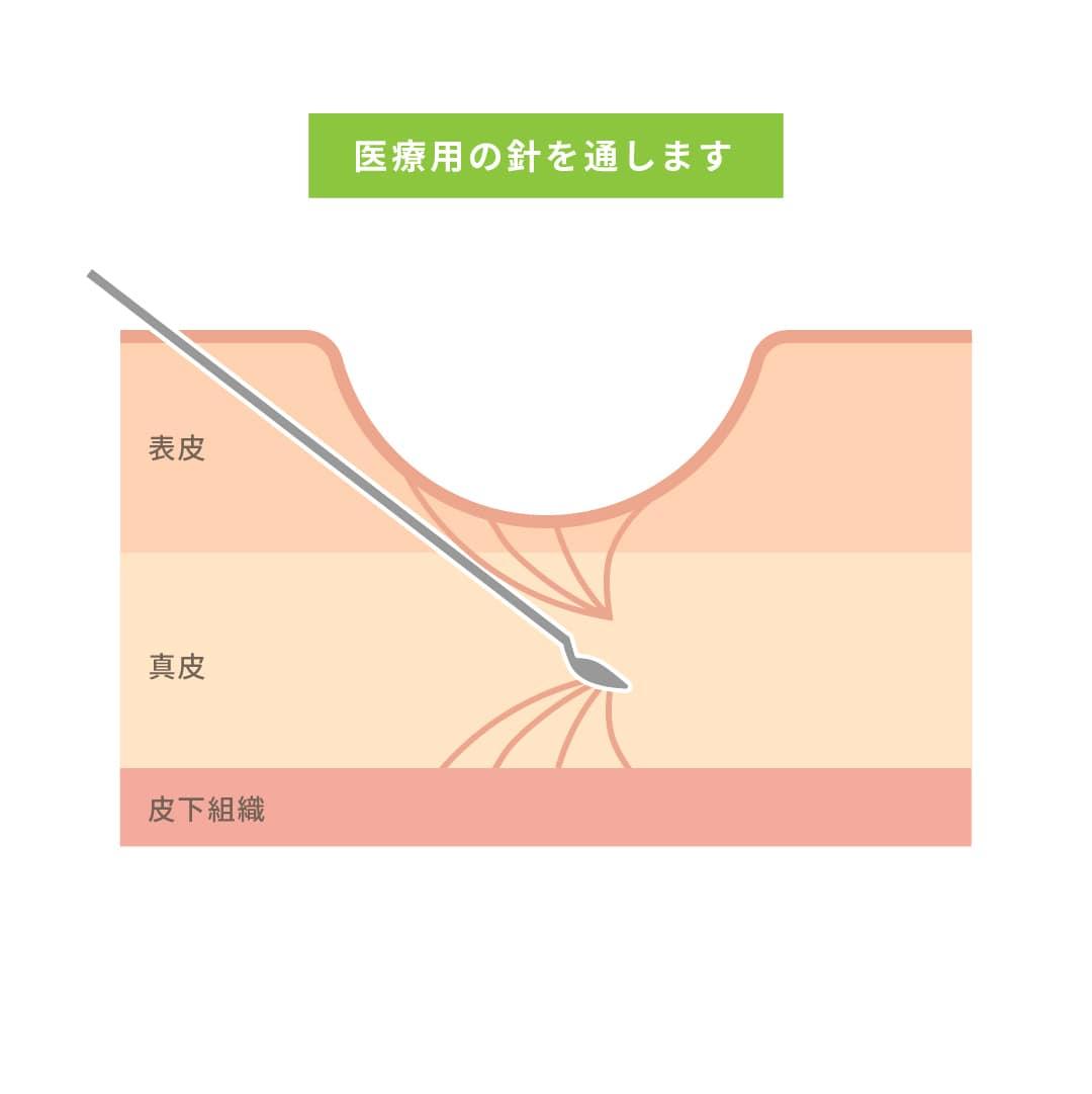 サブシジョンとは、ニキビ跡の凹凸やクレーター治療のために開発された医療用の針治療です。ニキビ跡は、炎症で皮膚の奥の部分が繊維化して真皮と筋膜が癒着してしまい、皮膚が下に引っ張られてクレーターやくぼみとなっていることがあります。その場合、癒着部分に針を通し、癒着を解除することで凹凸やクレーターが改善します。