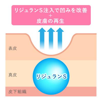 リジュランSをニキビ跡のくぼみや瘢痕に注入することで、くぼみにボリュームをもたせ、肌表面を平坦にしながら皮膚を再生する効果が期待できます。