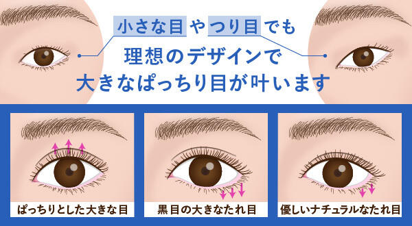 「目尻切開」単体よりも大きく広く白目・黒目を露出でき、デザイン性が高い施術なので、「パッチリとした大きな目」「流行りタレ目」など、理想の目元に近づくことができます。