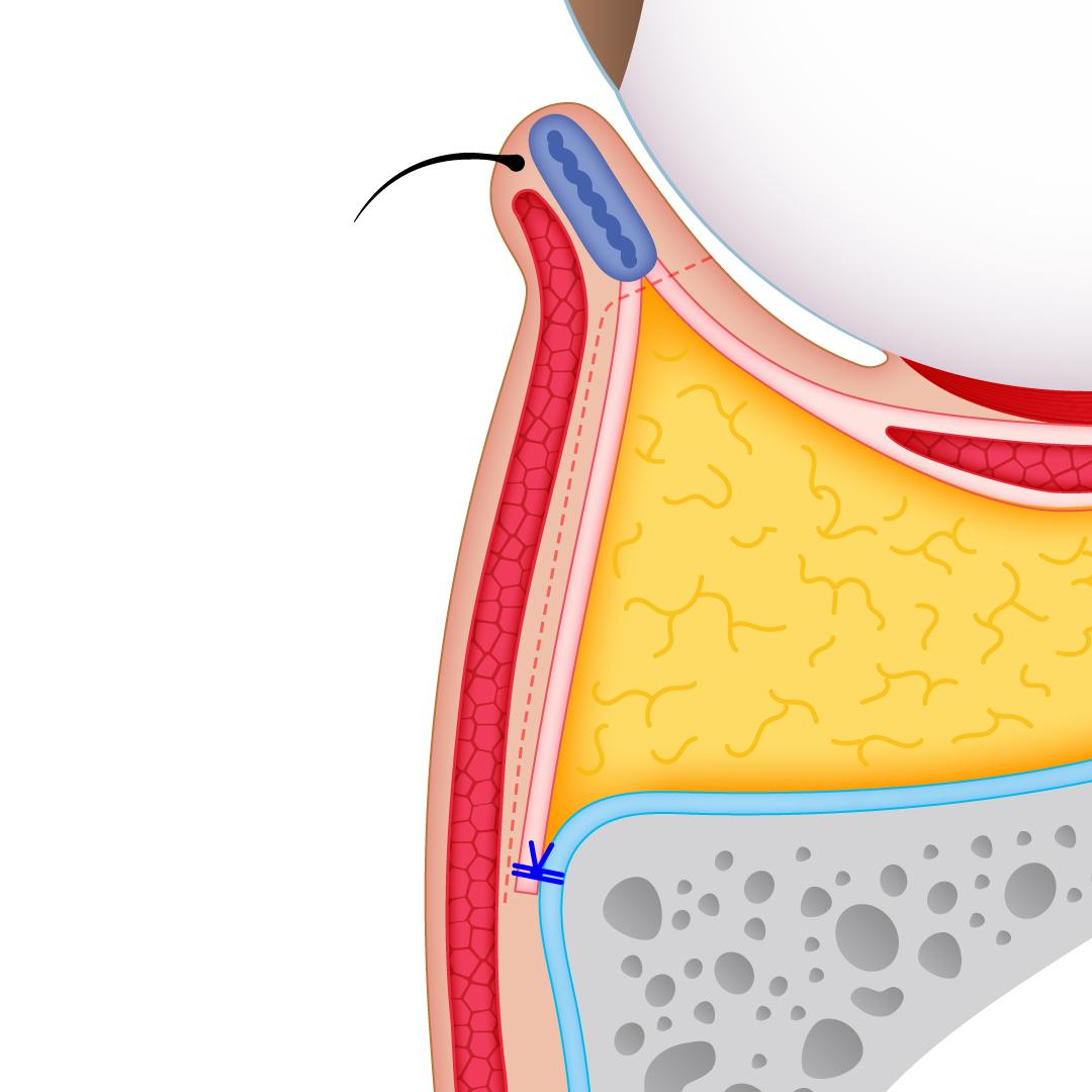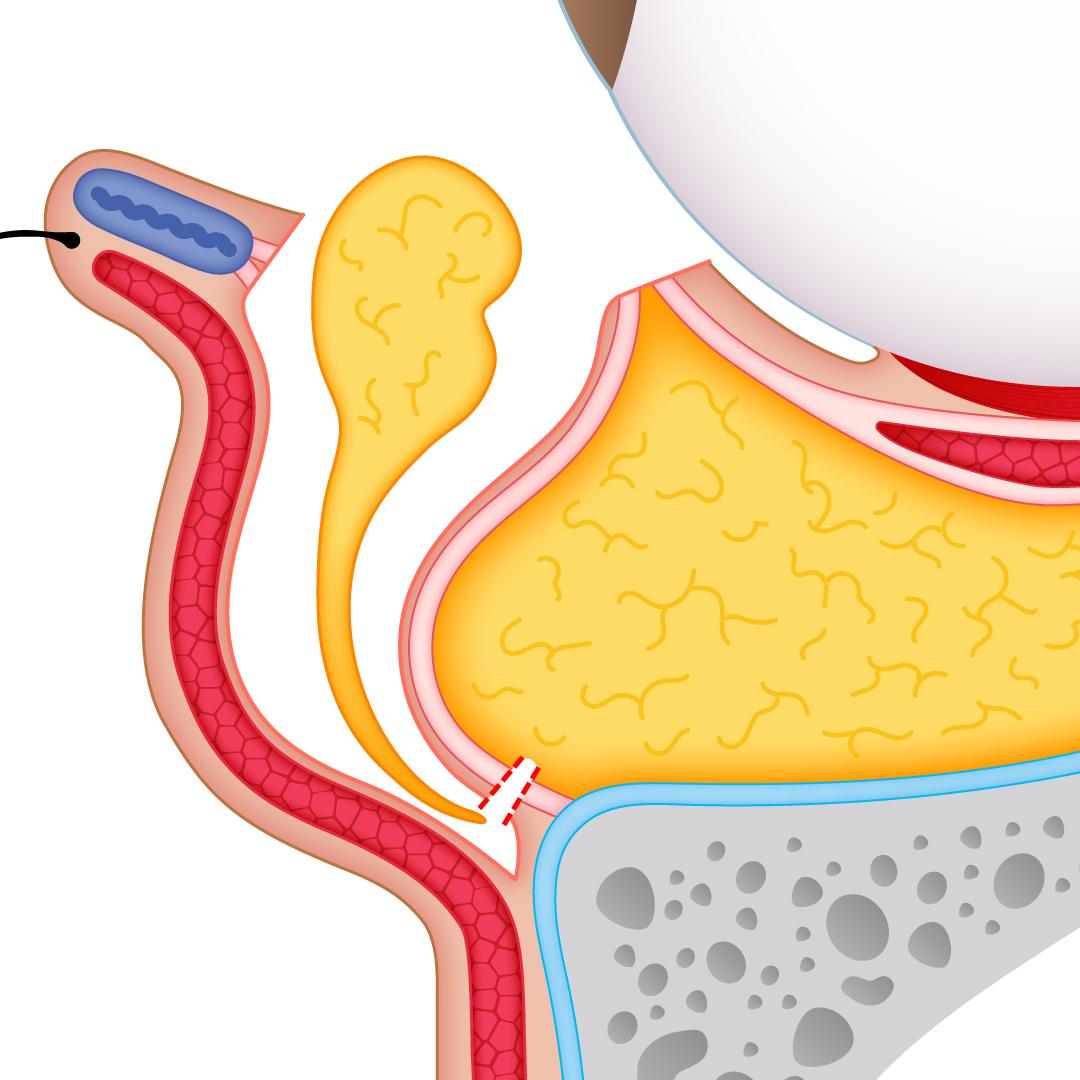 また隔膜の前からアプローチすることで、脂肪を奥まで取りすぎることによるまぶたがくぼんでしまうリスクや、術後の球後出血による失明リスクを極力回避することができます。