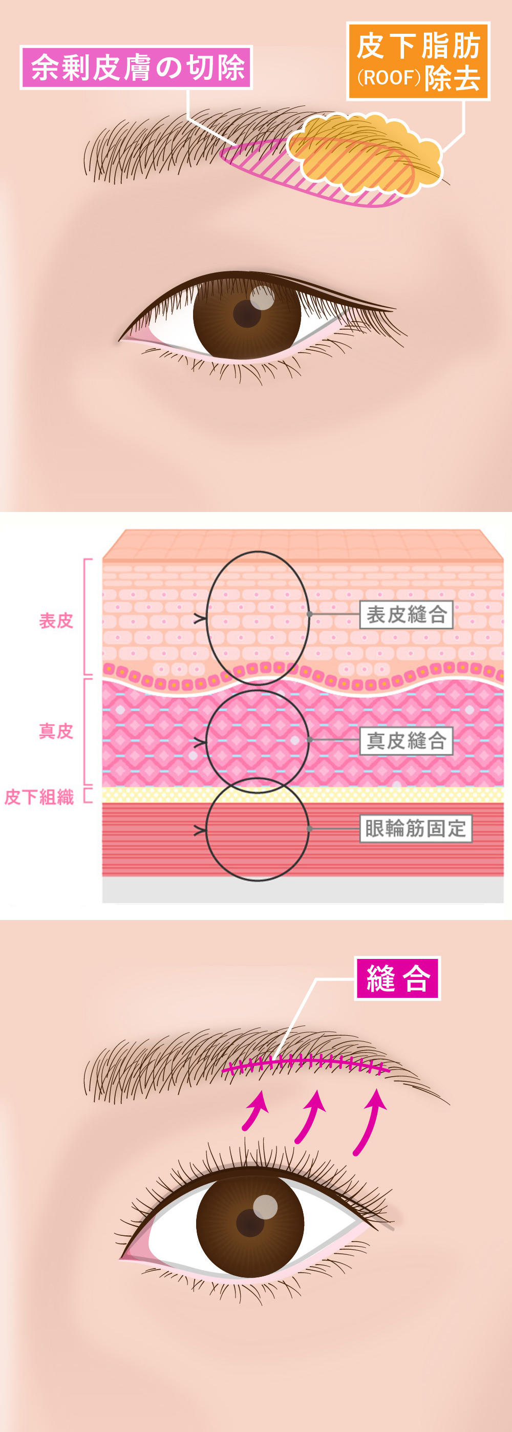 『眉下切開法』は眉下から余剰皮膚を切り取る施術で、皮膚による「上まぶた」のたるみを自然にしっかりと引き上げることが可能です。また、眉下のあたりに存在するROOFと呼ばれる皮下脂肪をあわせて除去することが可能なため、目の上付近の脂肪が多い場合にも同時に取り除くことができます。