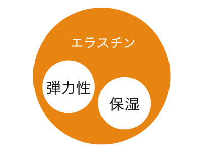 エラスチンは、伸縮性や弾性に優れた弾性繊維で、「柱」であるコラーゲン線維をとりまくように存在します。指で押したときに跳ね返る「バネ」のように、肌の弾力やハリを維持します。