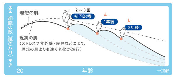 美容医療でも再生医療でも同じですが、老化現象にはあらがえないものです。注入した肌細胞も年月が経過すると徐々に老化が進み、細胞が衰えて働きが弱くなってきます。「細胞保管セルバンク」に細胞を保管していただければ、元気な肌細胞をいつでも補充いただけるので、健康的で理想の肌を維持し続け、老化の進行を遅らせることができます。オザキクリニックでは、肌メンテナンスとして1~2年に一度、元気な肌細胞の補充を推奨しています。