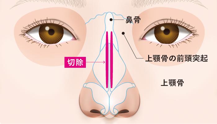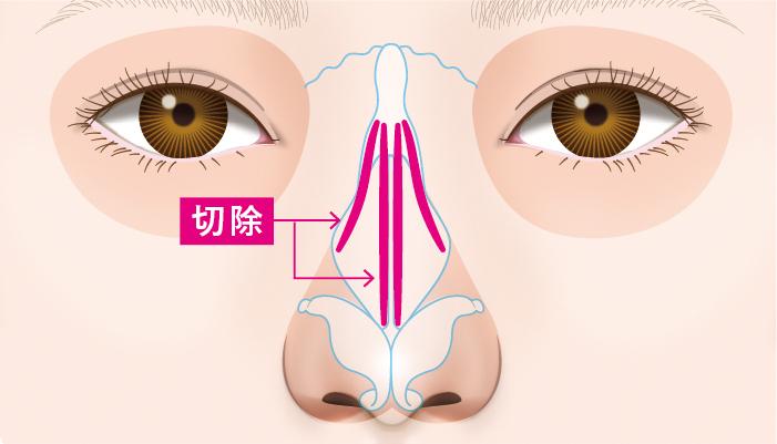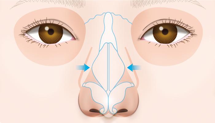 鼻骨の一部を切除し、幅寄せして固定することで鼻筋を細く、まっすぐに整えます。