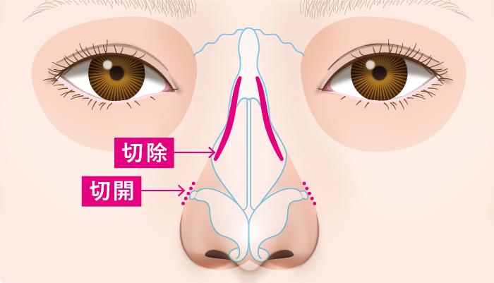 鼻骨骨切りは、鼻柱の横から切開をおこなう「オープン法」と、鼻の穴の中から切開を行う「クローズ法」の2つの手法があります。