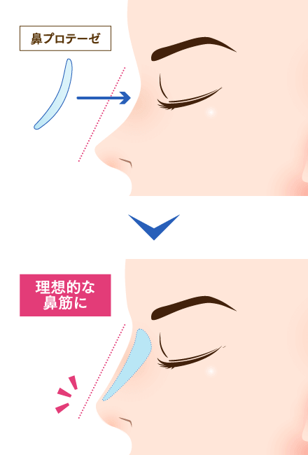 プロテーゼを鼻筋に挿入し、鼻を高くシュッとした印象の鼻筋にする隆鼻術です。プロテーゼは医療用のシリコンでできた人口軟骨で、耐久性に優れているため変形などの心配もなく安心してご使用いただけます。