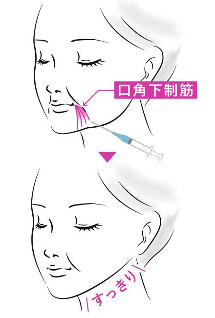「輪郭シェイプ」では、口角下制筋の働きもボトックスで緩め、口角がキュッと上げて、口周りをすっきりさせることもできます。
