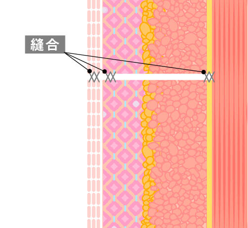 皮膚切開し、皮膚とSMAS(スマス)の間を剥離させます。SMASとは皮下組織(脂肪の層)と表情筋(筋層)の間にある筋膜のこと。SMAS切開をしてしっかりと引き上げることで、より高いリフトアップ効果を得ることができます。