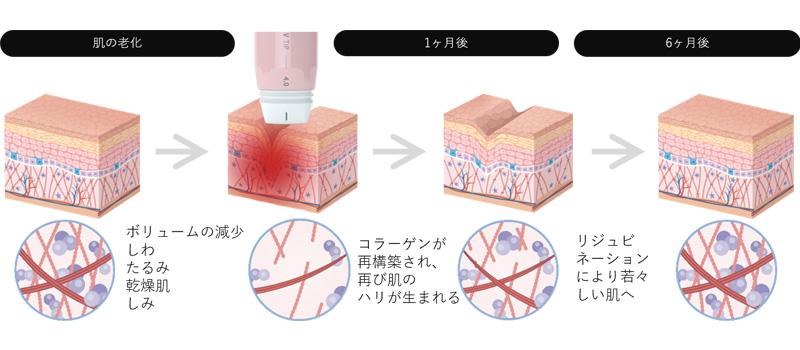 ボルニューマーは、高周波(RF)による最新のたるみ治療機器です。皮膚表面へのダメージを抑えながら真皮層と脂肪層に熱を与えることで、真皮層のコラーゲン生成を促し、肌のハリや弾力に効果が期待できます。また、脂肪層の線維質を増加させ、脂肪層の引き締め・たるみの改善を行います。