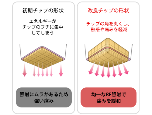 丸みを帯びた特殊なチップで照射ムラを防ぎ、均一な照射が可能になりました。これにより、痛みや熱損傷のリスクを大幅に軽減します。