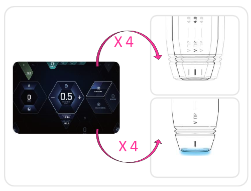 皮膚表面への熱損傷を防ぐため、コンタクトクーリング(水冷式)を採用しています。さらに4段階の振動と冷却システムが搭載されていることで痛みを感じにくく、痛み制御モードも搭載されていますので、ご不安な方もご安心ください。