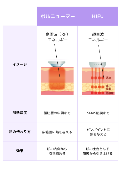 ボルニューマーは、高周波によって真皮層と脂肪層に広範囲かつ均一に熱を与えます。対してHIFUは、超音波を焦点照射(虫眼鏡で一ヶ所に集めるような照射)することで皮膚の土台であるSMAS筋膜にまで熱を与えます。このように、ボルニューマーとHIFUでは熱の伝わり方が異なってくるため、適応によってはボルニューマーとHIFUを組み合わせることでよりよい治療効果を得ることができます。