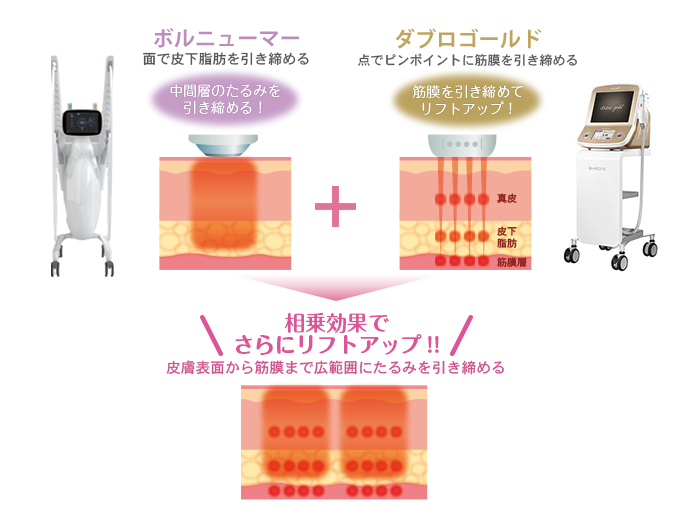 当院ではダブロゴールドという医療用HIFUを採用しています。ダブロゴールドでは肌の深い層までアプローチでき、ボルニューマーでは、ダブロゴールドで難しい肌表面へアプローチすることが可能です。