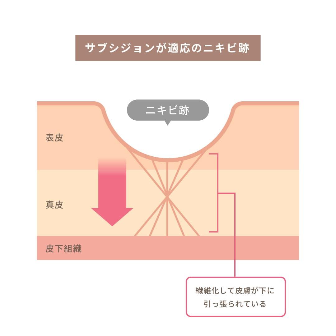 ニキビ跡には様々な種類のものがあります。医師が丁寧に肌を診察し、サブシジョンの治療が適応かどうか診断いたします。サブシジョンの治療が適応のニキビ跡としては、