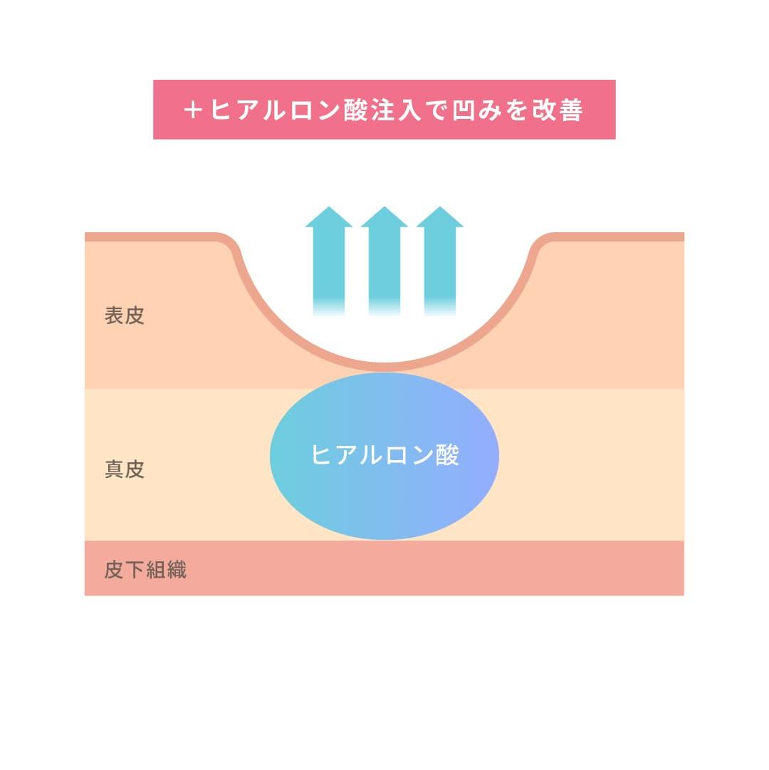 適応があり、希望される場合は、凹んだ皮膚を持ち上げたり、再癒着を防ぐ効果のあるヒアルロン酸注入も行います。陥没が大きく、凹凸が脂肪層にまで及んでいるタイプのニキビ跡にも有効です。
