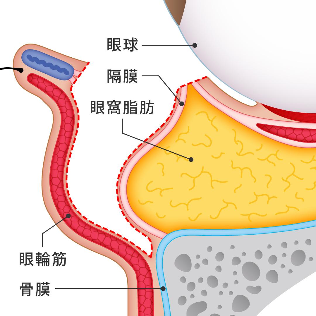 眼球を支える役割を持つロックウッド靭帯が年齢によって弱ってくると、眼球を支えられなくなり、圧迫された「眼窩脂肪」が前に突出してきます。この突き出た「眼窩脂肪」がたるみ(膨らみ)の要因となります。
