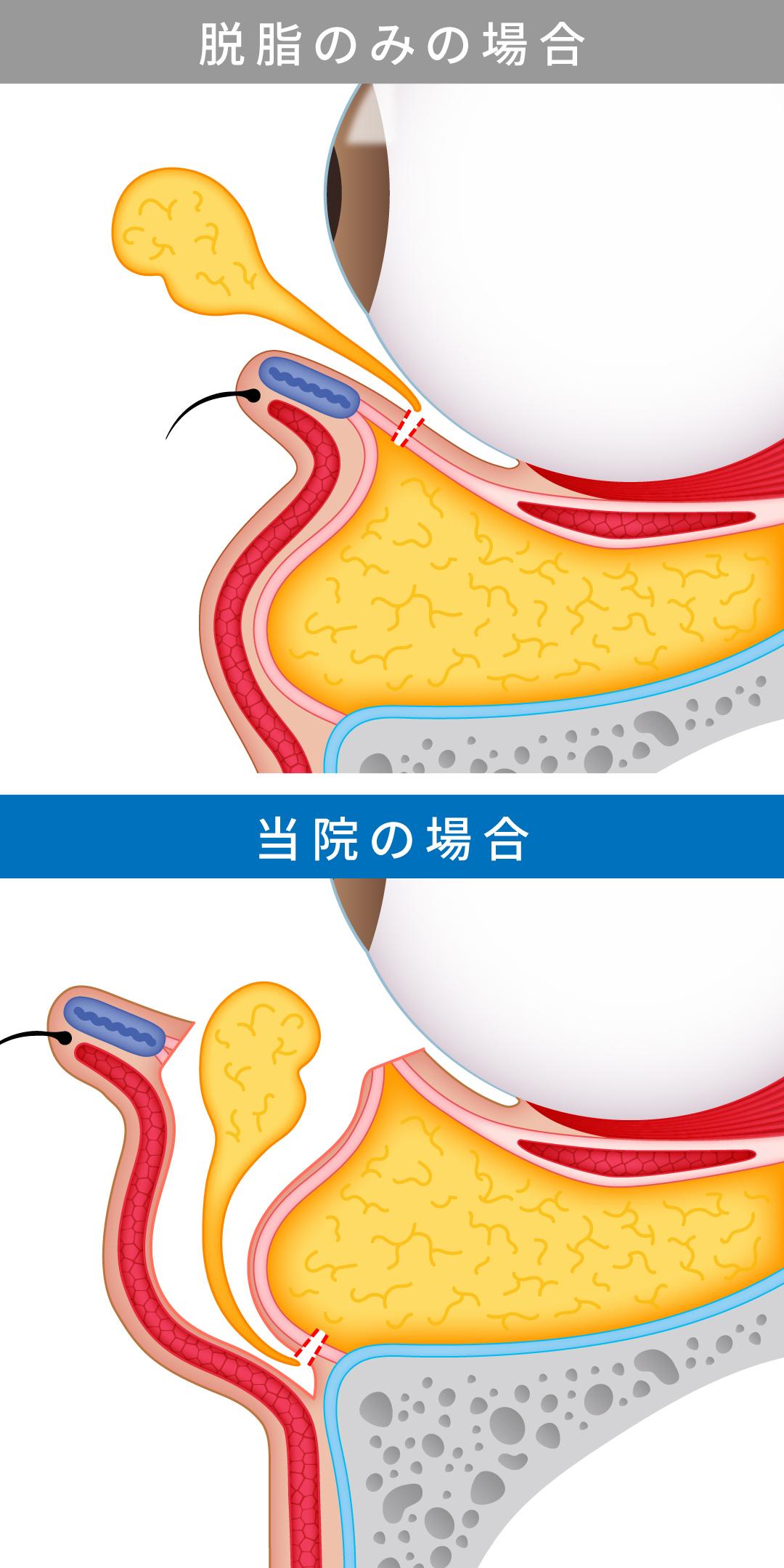 また隔膜の前からアプローチすることで、脂肪を奥まで取りすぎることによるまぶたがくぼんでしまうリスクや、術後の球後出血による失明リスクを極力回避することができます。