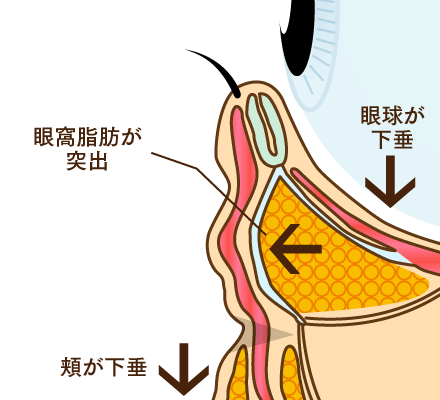 年齢を重ねると、眼球を支える靭帯が衰えてくるので、眼球は徐々に下垂してきます。すると眼球の周りにある眼窩脂肪が圧迫されてしまい、手前へと飛び出してきます。これが目の下の膨らみの正体で、メイクなどで隠すのが難しいたるみ症状です。