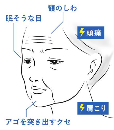 眼瞼下垂の方は視野が狭くなることで、無意識に眉を吊り上げて目を開こうとしたり、顎を上げながら物を見るようになります。慢性的に筋肉が緊張するため、頭痛や肩こりの原因となり、悪化すると吐き気や目まいを引き起こすこともあります。