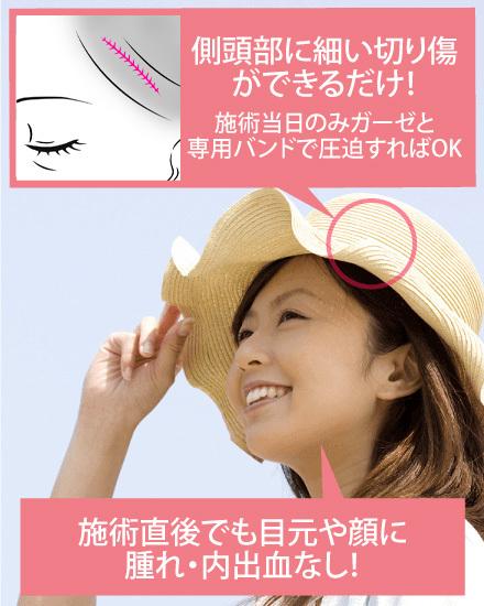 しかも、目元や顔の目立つところが腫れたり内出血したりがないので、帽子などをかぶってしまえば、施術直後でもほとんど分かりません。