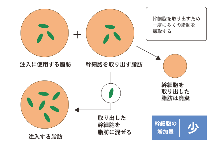 こちらの方法では脂肪の吸引から注入まで、1日で治療を終えることができますが、幹細胞を抽出する脂肪と注入するための土台となる脂肪の両方を一度に吸引するため、多くの脂肪を採取する必要があります。当然、身体にかかる負担も大きいものとなります。また、体の中にある幹細胞を移動させるだけのため、幹細胞の量自体は増えません。