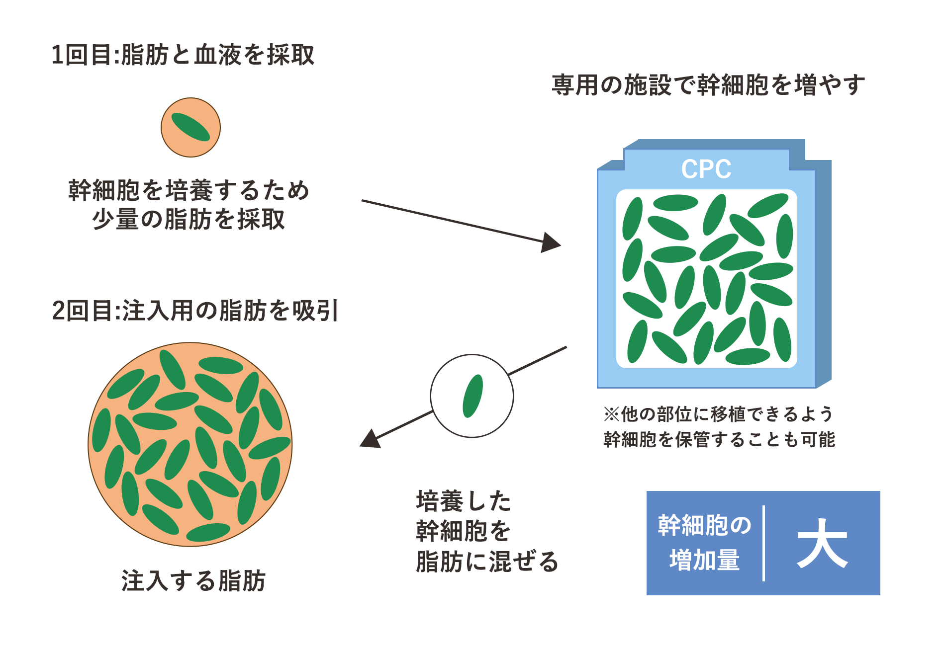 脂肪注入の際に自身の脂肪幹細胞を培養させたものを混ぜることで、幹細胞自体が脂肪に変化したり、栄養と酸素を届ける血管を作る働きを促進。脂肪が吸収されにくい環境を作り出します。その生着率は70~80%とする論文も発表されており、近年特に注目を集めている治療法です。