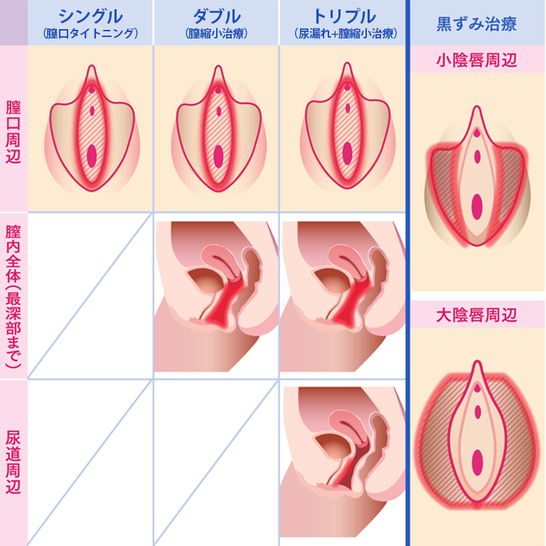 インティマレーザーは複数の治療プランからお選びいただけます。照射範囲がプランにより異なりますので、どのプランが合っているか症状やお悩みにあわせてご提案をいたします。