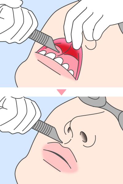 まずは唇をめくり、裏側を照射していきます。その後、鼻下の皮膚表面を照射します。