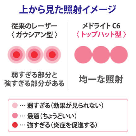シミ治療に用いられるレーザーの多くは、照射するレーザー光が「ガウシアン型」と呼ばれる山の形状をしています。山形なので、レーザーの中心部ほどエネルギーが高くなり、端に向かって徐々にエネルギーが弱くなるという、“ムラ”が発生していました。