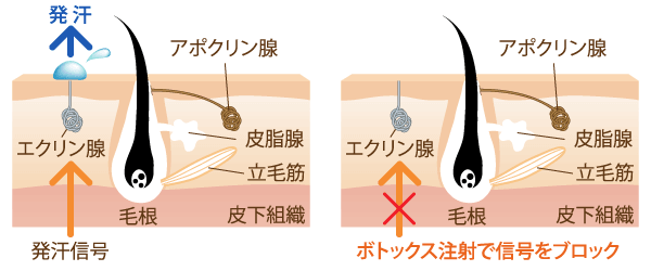 「ボトックス」は、ボツリヌス・トキシンから抽出されたタンパク質の一種で、一過性の筋肉麻痺を起す作用があります。この作用を利用することで「エクリン腺」の働きを抑制し、汗の分泌量をコントロールします。汗の分泌量が減るので、自然とニオイも軽減されます。