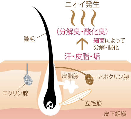 ワキから生じる独特のニオイは、「アポクリン腺」から分泌される汗が皮膚に存在する菌に分解されることで発生します。