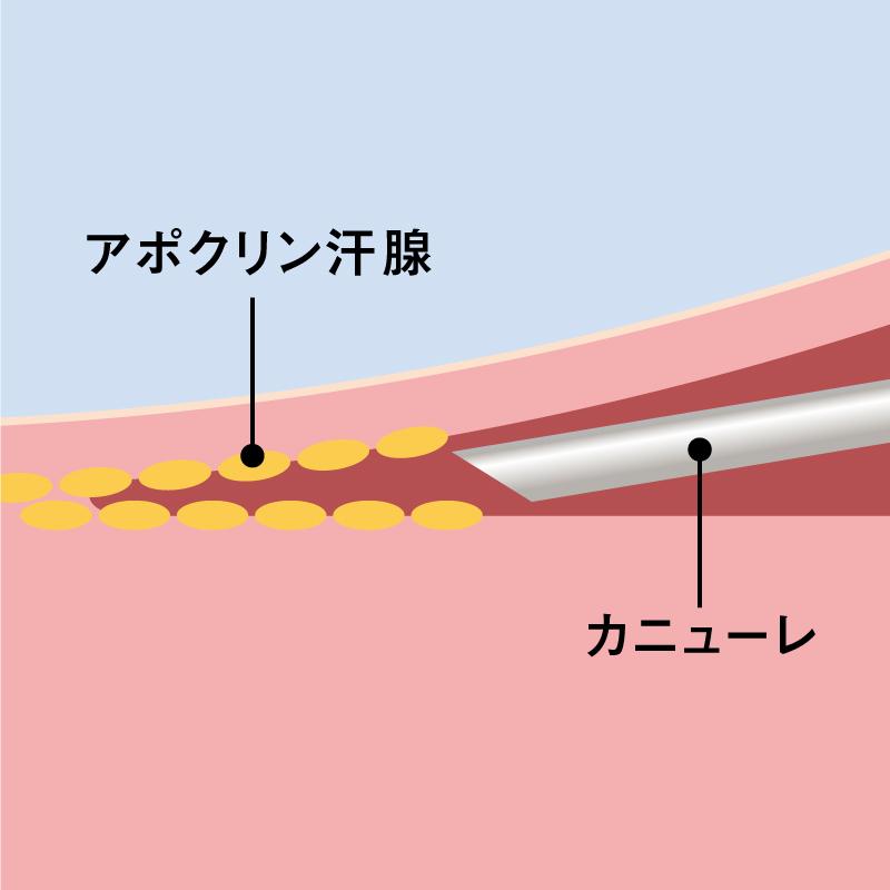 吸引器(カニューレ)を挿入し、アポクリン汗腺を除去していきます。周辺組織、神経、血管は傷つけないよう丁寧に施術します。