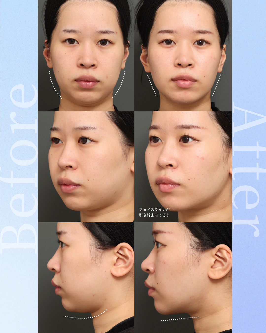 フェイスラインのもたつき・二重アゴに対し、頬・アゴ下の脂肪吸引をおこないました。輪郭がすっきりし、小顔印象へ。