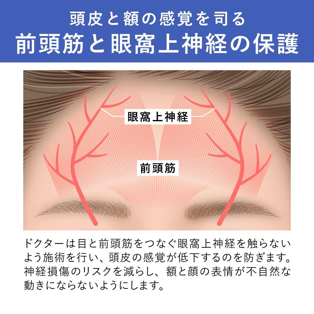 眼窩上神経とは、額から頭頂部の皮膚、上瞼などの知覚を支配する神経です。オザキクリニックの額縮小は、眼窩上神経を触らない術式をとり、頭皮の感覚が低下するのを防ぎ、額の動きと表情が自然なまま保たれるよう配慮しております。