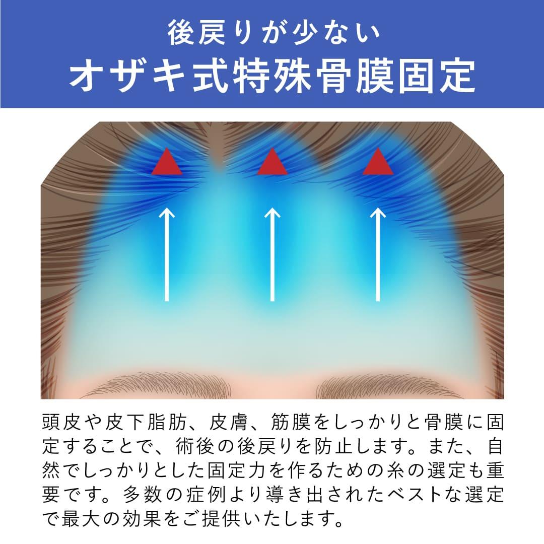 オザキクリニックの額縮小の固定方法は、多数の症例により洗練された骨膜固定法をとっております。それにより、自然でしっかりとした固定力が作られ、効果を最大限まで引き出します。
