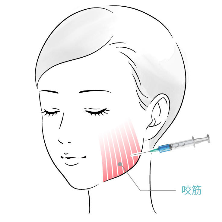 奥歯をぐっと噛みしめたときに耳の下あたりに大きなふくらみができる場合は、咬筋が発達しています。張り出したエラの筋肉に「ボトックスビスタ®」を注入することで、筋肉の働きを弱め、張り出したエラを萎縮させることで目立たなくなり、小顔を形成します。筋肉の発達状態によって、筋肉を緩和させるのに数回の施術が必要になる場合がありますが、繰り返し注入することで、過剰な筋肉の発達を抑制し、細くなった筋肉の状態を長く維持できるようになります。