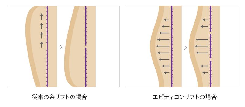 また従来の糸リフトは、糸が溶ける過程で引き上げ効果が弱まってしまうことがありましたが、エピティコン糸ではこのリボン型のコグを利用することにより、部分的に糸が溶けてしまったり切れてしまった場合でも、よりリフティング効果を持続させることができます。