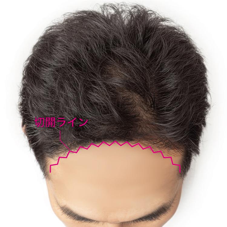 1人ひとりに合わせたヘアラインをデザインします。生え際部分が自然な仕上がりになるように、細かくジグザグに切開していきます。