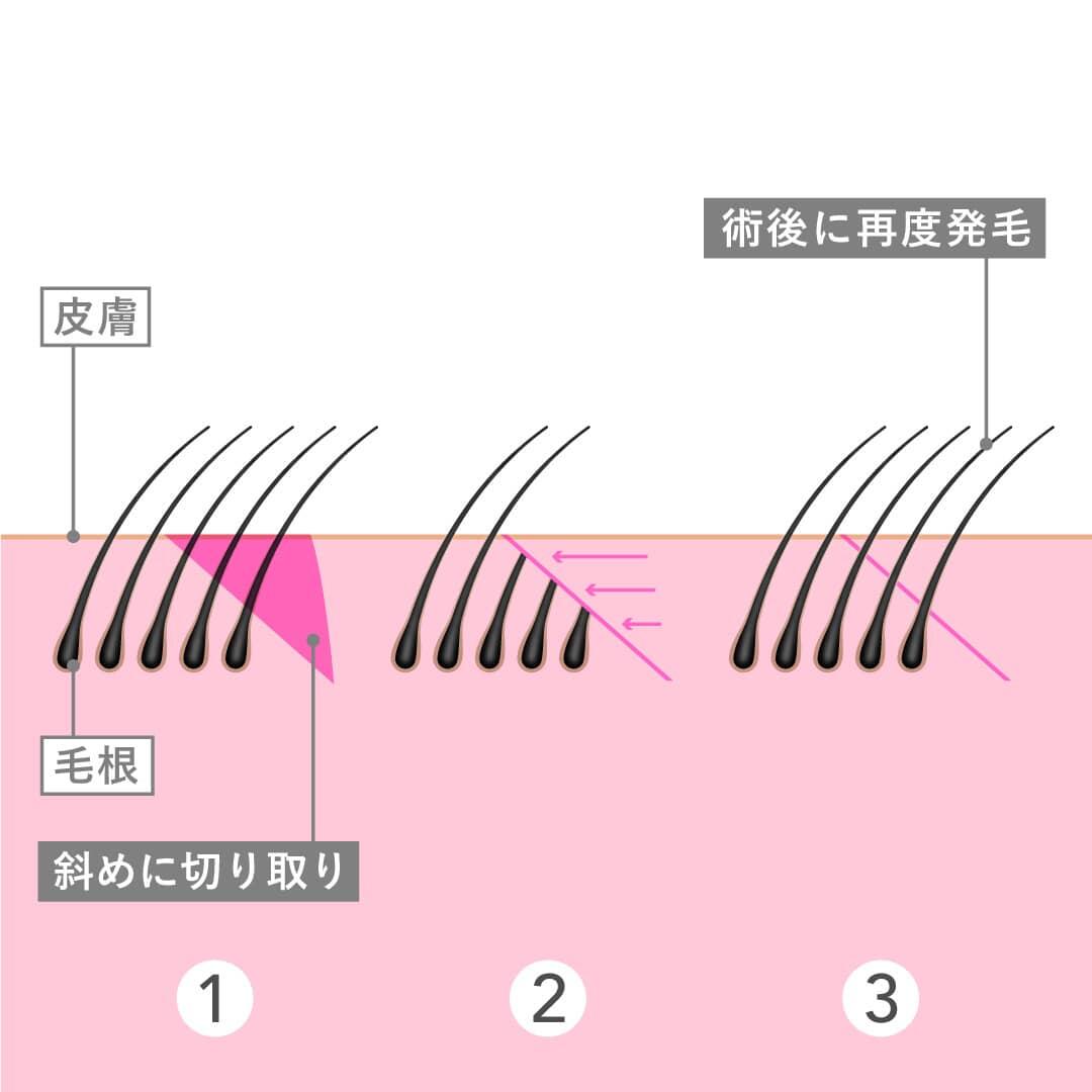 「毛包斜切断法」は、毛根を痛めずに切開する繊細な切開方法です。手術後に発毛を促し、傷跡は最終的には毛髪で隠れます。発毛後は傷跡が目立ちにくく、ほとんど気にならないほどになります。