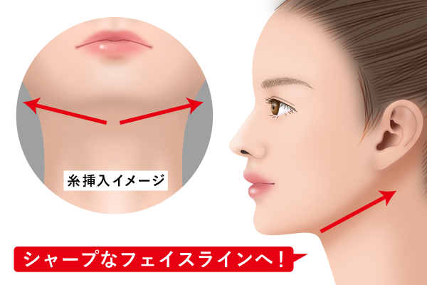 アゴ下から糸を挿入し、エラの下あたりから引き上げることで皮膚や脂肪のもたつきを改善させます。
