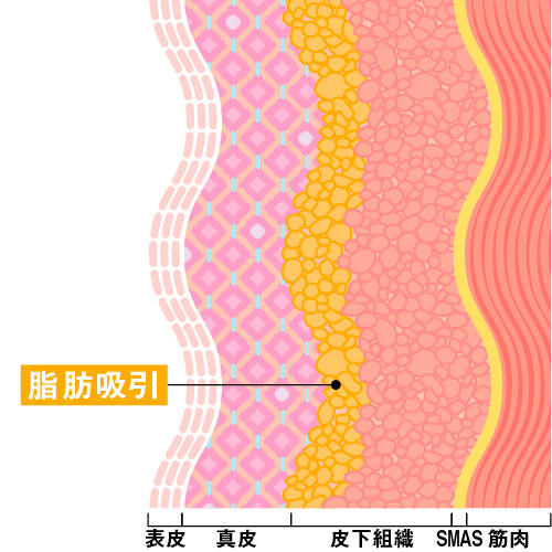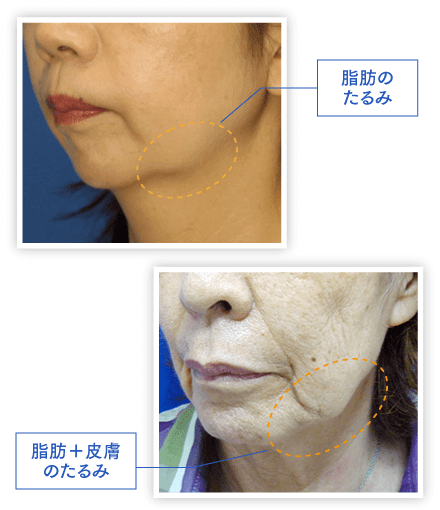 若いうちは脂肪を取り除いても伸びた皮膚は引き締まりますが、年を重ねた皮膚は収縮性が悪いため、脂肪を取り除くだけでは、たるみの解決にはなりません。