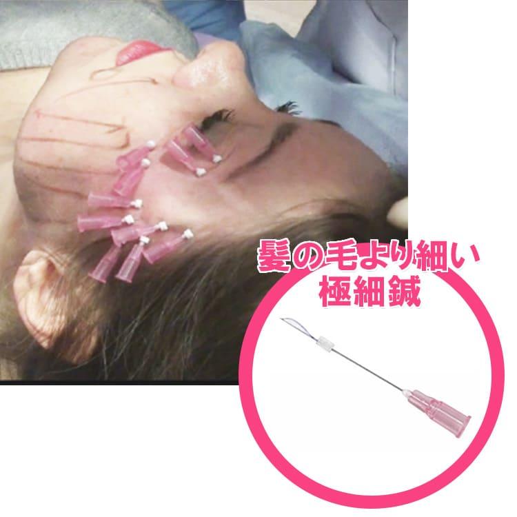 ショッピングリフトは、鍼を多数使用するので痛みが気になるところですよね。使用する鍼は髪の毛よりも細い、極細鍼を使用します。また、表面麻酔も行うため、痛みは少ないです。痛みが気になる方はご相談ください。