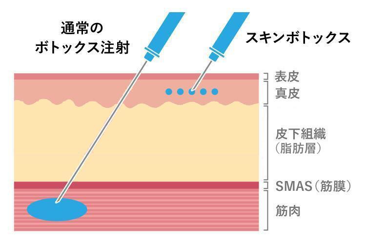 スキンボトックス(マイクロボトックス)は、表情筋に働きかけ表情ジワを改善させる一般的なボトックス注射とは異なり、皮膚の浅い層へボトックスを注入することで肌の引き締め効果や毛穴の縮小、小ジワなど改善させる治療です。