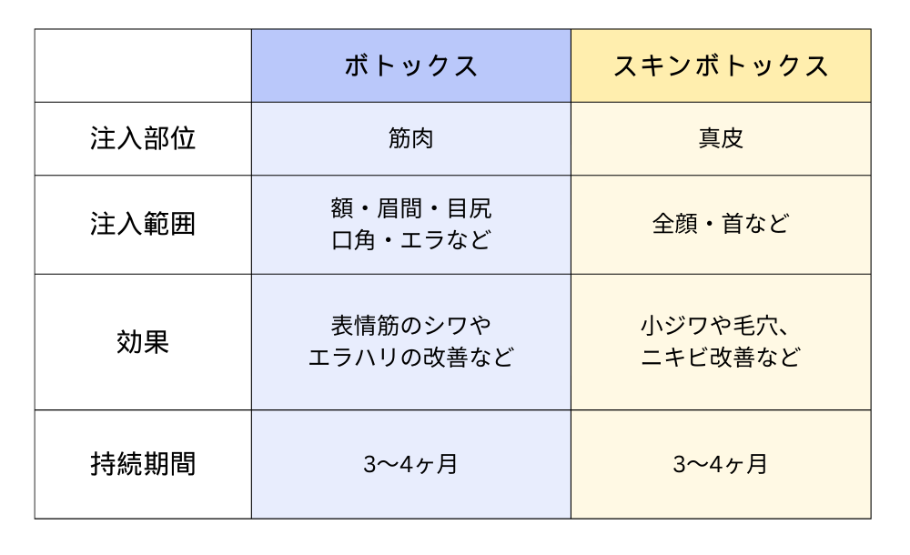 ボトックスとスキンボトックスの違いを表にしました。通常のボトックスとスキンボトックスでは、注入部位や注入範囲、期待出来る効果が異なります。