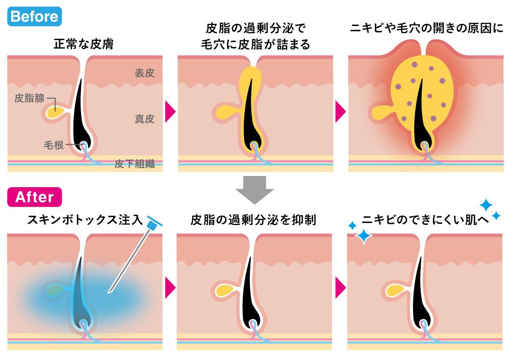 ニキビや毛穴の開きの原因の一つに、皮脂の過剰分泌が挙げられます。そのため、ボトックスを打って皮脂腺や汗腺に働きかけることで皮脂分泌を抑制し、ニキビのできにくい肌へと導き、毛穴の開きも改善することができます。